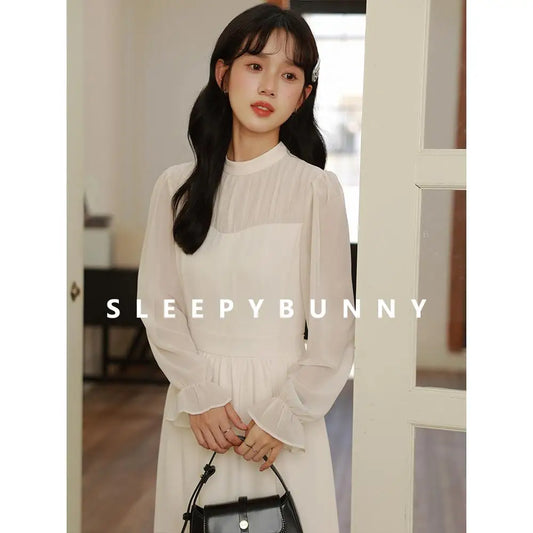 Elegant Autumn Midi Dress Women Pleated Mock Neck A-Line Dress with Sheer Long Sleeves Slim Fit Patchwork Design Office or Date