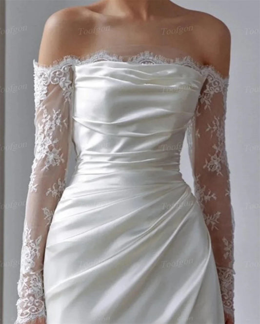 Toofgon Customized Lace Long Sleeves Wedding Dresses Sheath Pleats Spandex Satin Wedding Bridal Gowns Bride Formal Party Dress